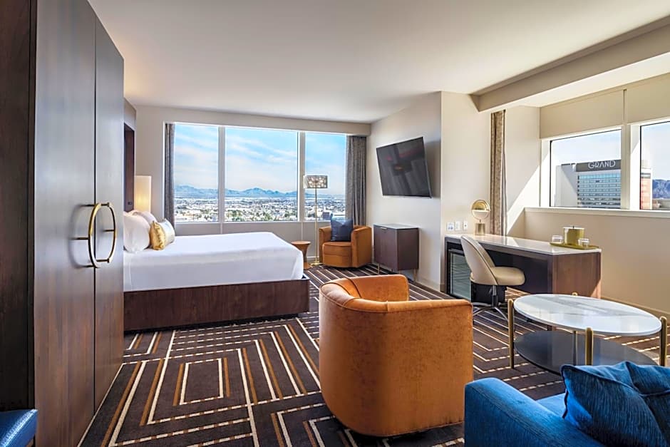 Corner Studio (1 King Bed) is 527 square feet and includes a king-size bed 150-183 width plus cable tv, hairdryer, safe, and bathrobes.